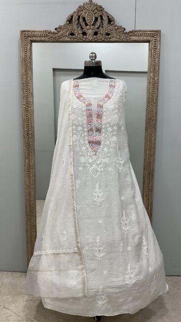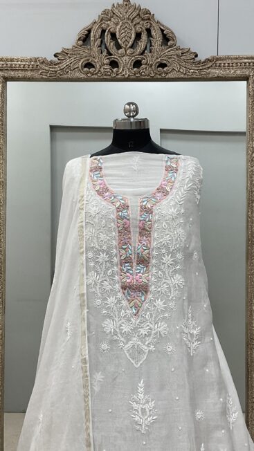 Pure Mul Cotton Straight Parsi Work,Pearl And Addon Work With Dupatta White 03