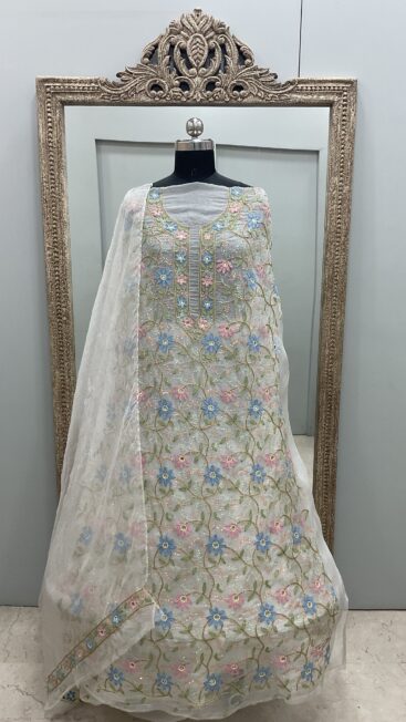 Pure Organza Semistiched Straight With Chickan And Addon Work Off White 02