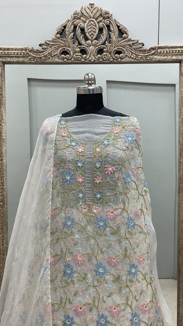 ₹12,500.00Pure Organza Semistiched Straight With Chickan And Addon Work Off White 02