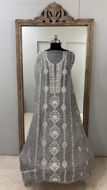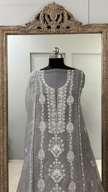 ₹11,500.00Pure Organza Semistiched Straight With Chickan Work Off White 05 -