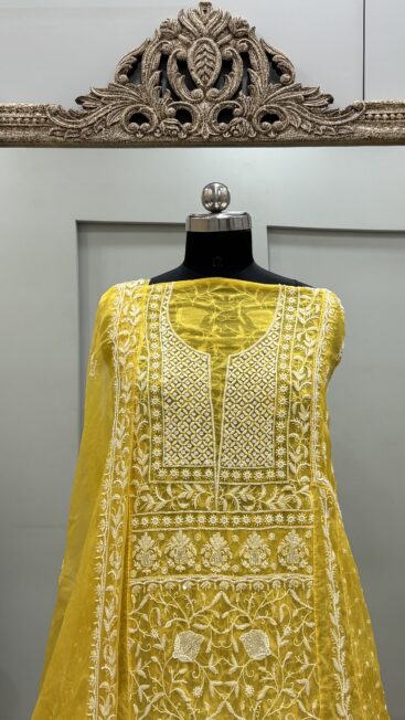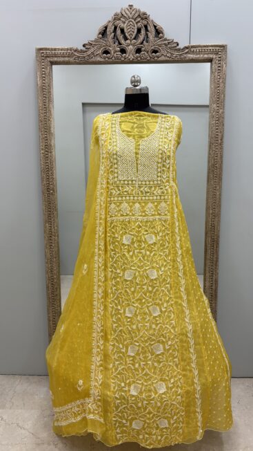 ₹12,500.00Pure Organza Semistiched Straight Parsi Work With Shirt And Dupatta Yellow -