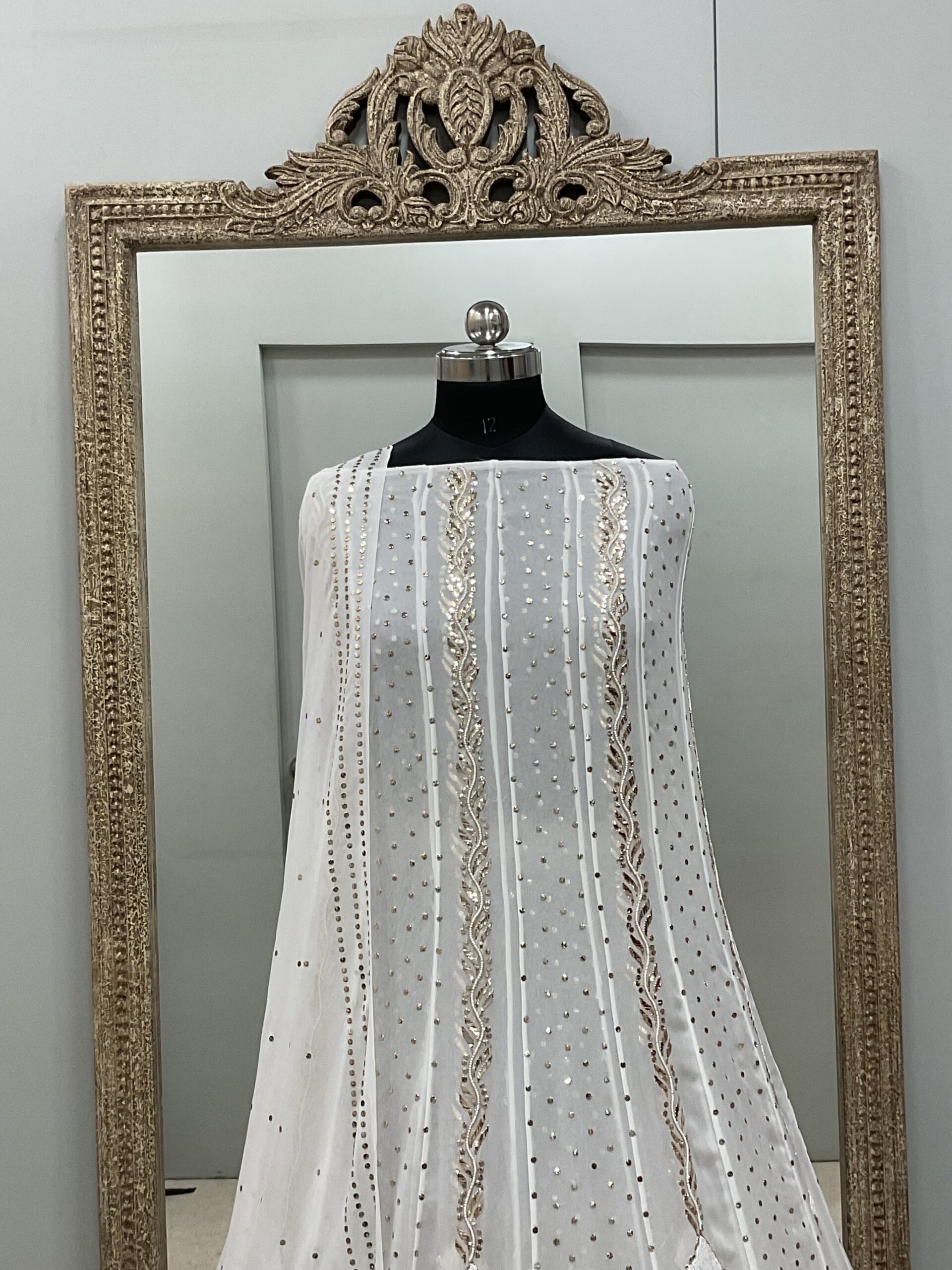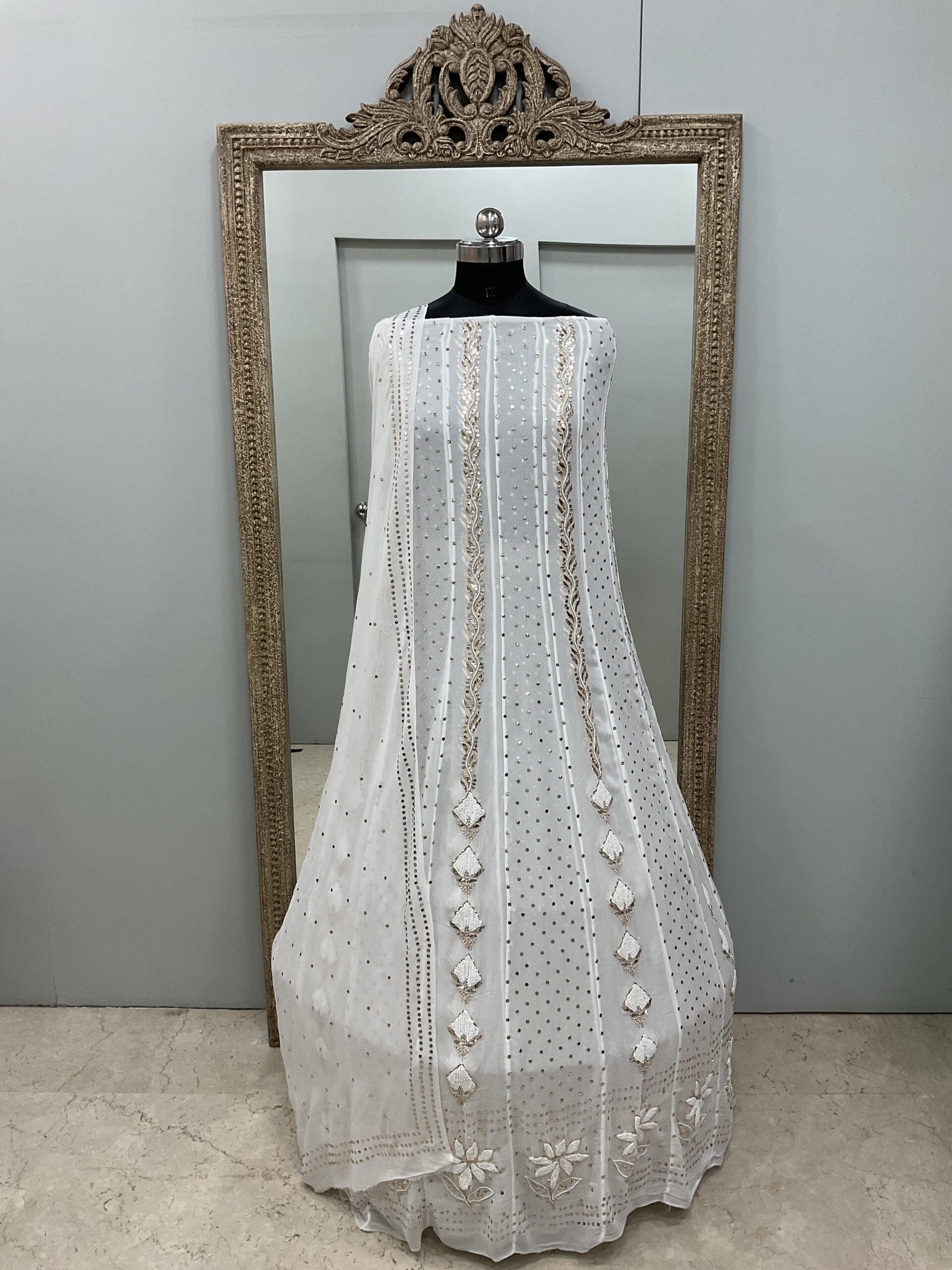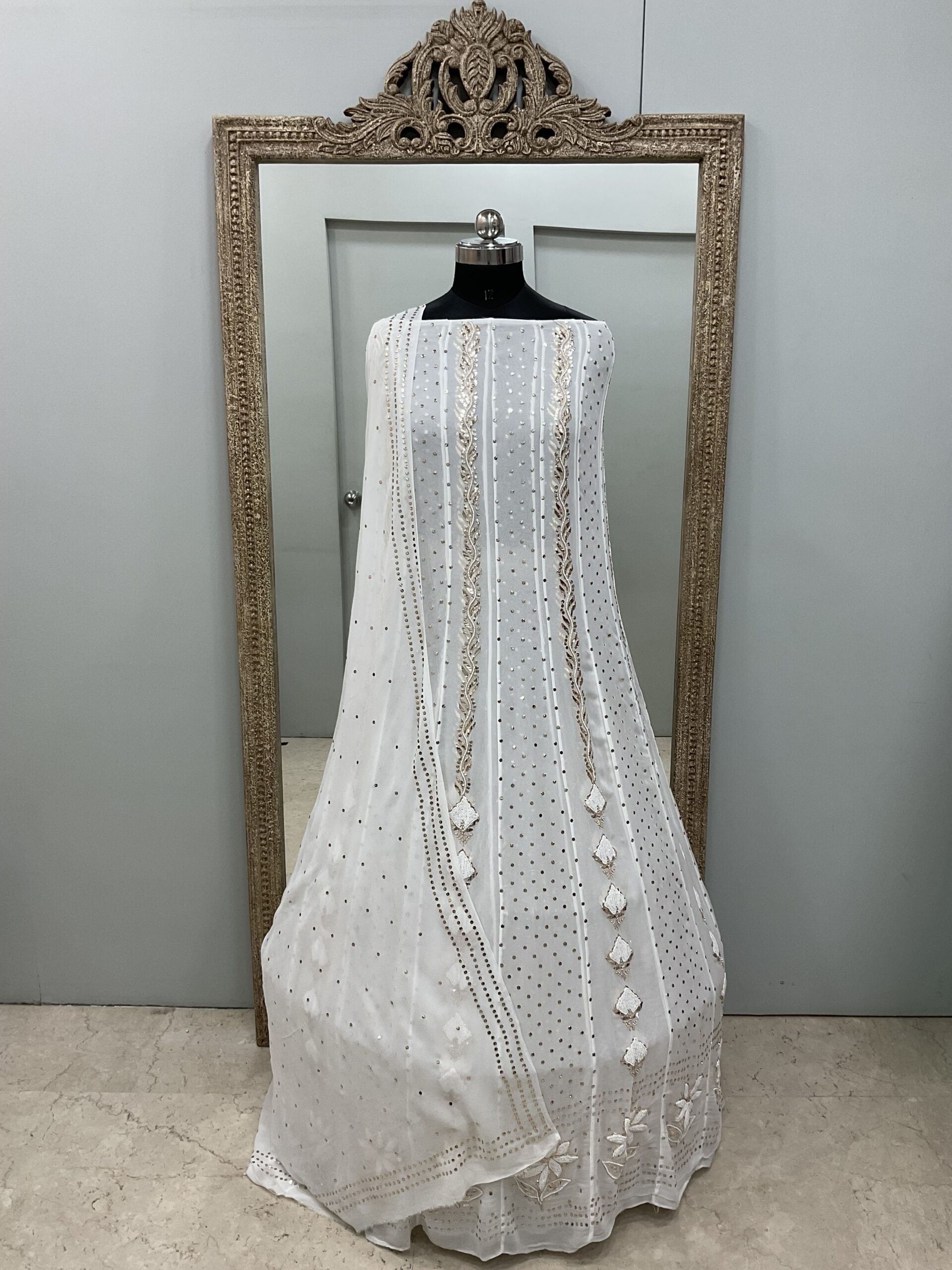 Be the first to review “Pure Georgette Badla Mukaish Anarkali and Dupatta Off White”