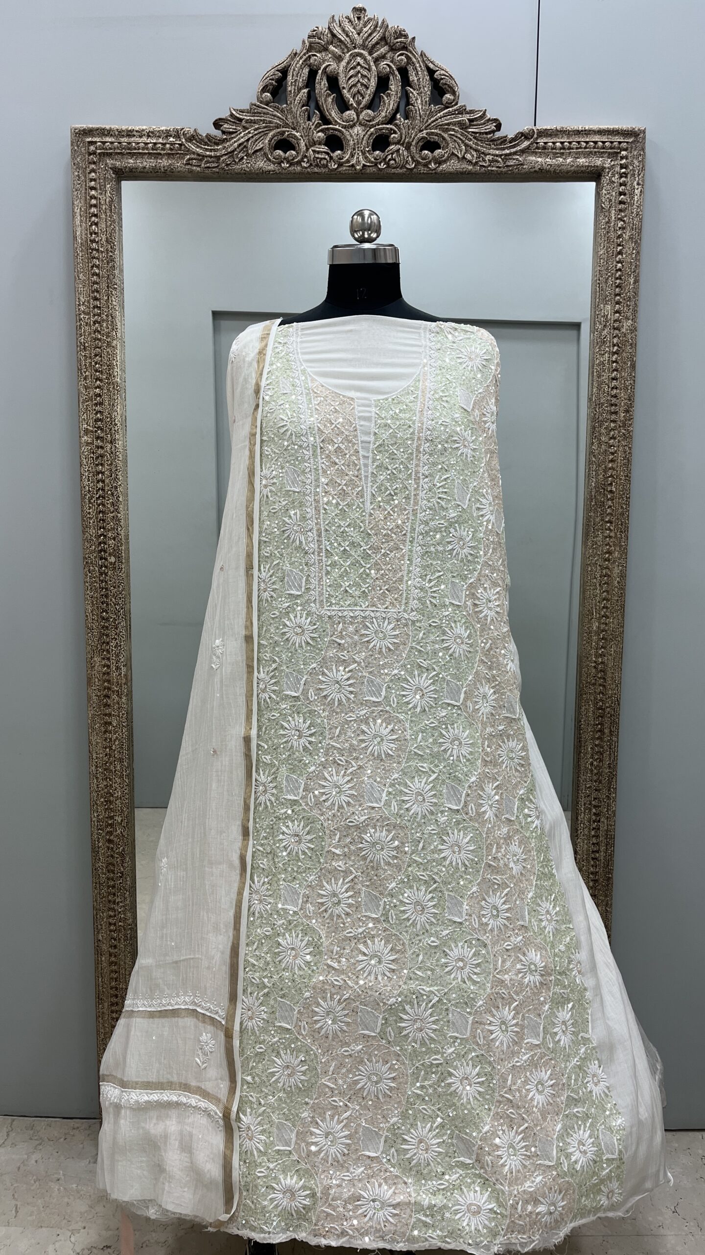 | Work | White Pearl and Cutdana with Chickankari Embroidery |